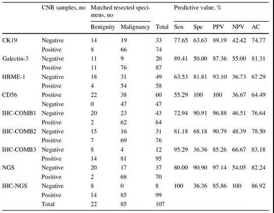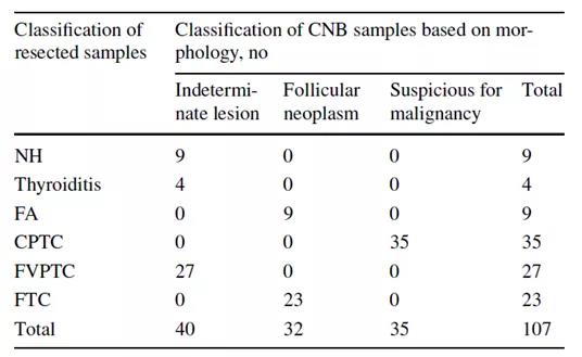 本研究回顾性分析107例同时具有CNB及匹配的切除标本的甲状腺结节患者,并根据临床诊断标准进行诊断和归类。