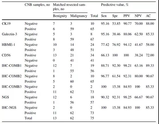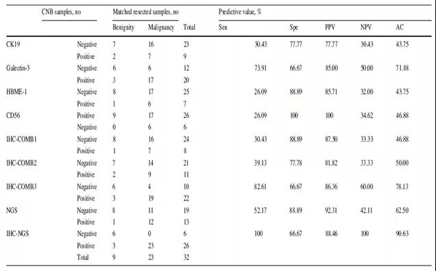 免疫组织化学(IHC)是病理学最常用的辅助技术。以往研究表明,检测CK19、galectin-3、HBME-1和 CD56有助于区分甲状腺结节的良恶性[5,6,7,8]。本研究对CNB样本进行IHC检测分析后发现CK19、galectin-3、HBME-1的阳性率分别为:69.16%、81.31%和54.21%,而CD56阴性率为43.93%(表3)。