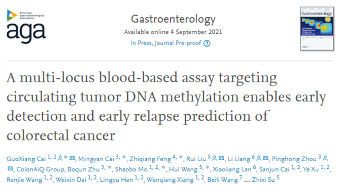 近日,国际胃肠疾病领域顶级期刊《Gastroenterology》(IF 22.7)发表了由上海英国威廉希尔技术有限公司(以下简称“英国威廉希尔”)联合复旦大学附属中山医院、复旦大学附属肿瘤医院、广州市第一人民医院、南方医科大学南方医院、四川大学华西医院、大连大学附属新华医院的重磅科研成果:“A multi-locus blood-based assay targeting circulating tumor DNA methylation enables early detection and early relapse prediction of colorectal cancer(血液多基因甲基化检测可实现结直肠癌早筛和复发预测)”。