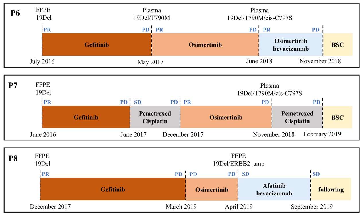 肿瘤之所以难以治愈,很大原因是由于肿瘤在治疗的过程中发生了耐药、进展。本研究描述了3名对EGFR TKIs产生了获得性耐药患者的临床治疗过程,并展示了基因组检测对于帮助临床医生区分每个患者的特定耐药机制并制定个性化医疗策略的价值(图2)。