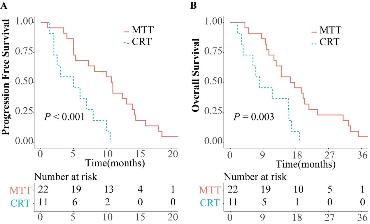 基因型靶向治疗的发展大大改善了肺癌的治疗。在随访的33名患者中,22名接受靶向药物的患者的中位PFS和中位OS分别为10.9个月和17.1个月,显著高于接受放化疗的患者(P < 0.001和P=0.003;图3)