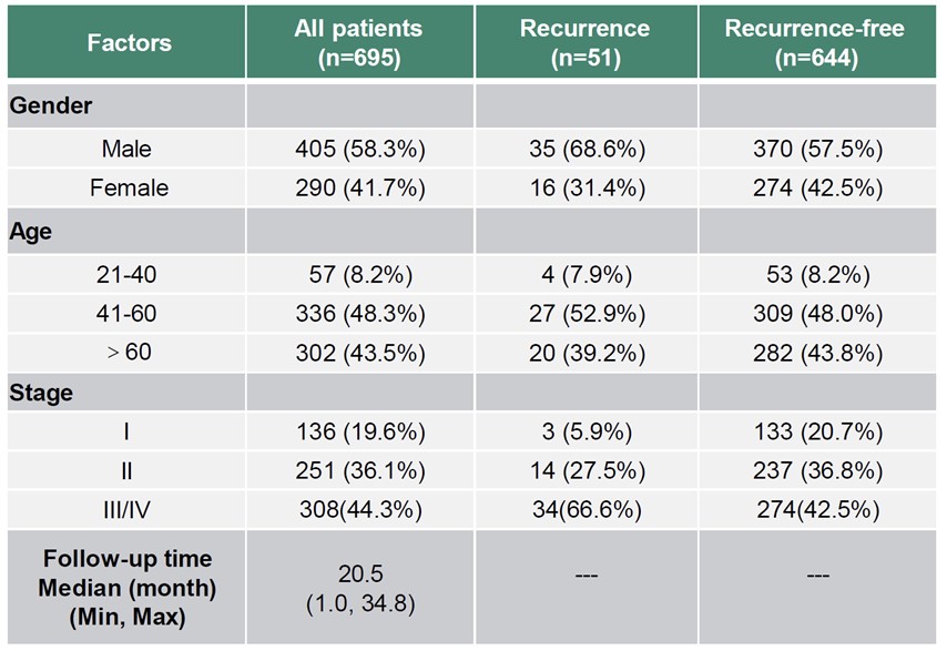 英国威廉希尔联合中国医学科学院肿瘤医院、中山大学肿瘤防治中心、四川大学华西医院、哈尔滨医科大学附属第二医院、中国医学科学院肿瘤医院深圳医院、长海医院、山西省肿瘤医院等单位,开展了一项大型前瞻性多中心队列研究(Protector-C研究),旨在为结直肠癌患者术后监测(微小残留病灶(MRD)检测)提供临床支持。本次大会公布了研究的中期分析结果。在 2022年7月至 2024年6月期间,共纳入了805名未曾接受过治疗的结直肠癌患者,这些患者均接受了R0切除手术,并且有至少10个月的随访时间。其中,695名患者完成了完整的POM1 ctDNA检测(中位随访时间:20.5个月;51例复发)(表1)。超过一半的入组患者处于早期阶段,包括136例I期(19.6%)和251例II期(36.1%)。在基线检查时,常艾克的检测灵敏度明显高于CEA。大多数患者的POM1 ctDNA水平显著下降,表明肿瘤负荷发生了动态变化。POM1时ctDNA阳性与较短的无病生存期(DFS)显著相关(P<0.001)。此外,术前和术后均保持ctDNA阳性的患者(双阳性)复发风险显著高于术前和术后均保持ctDNA阴性的患者(P<0.001)。此次中期分析证实了常艾克能较敏感地检出MRD,且在复发风险分层方面具有临床有效性。
