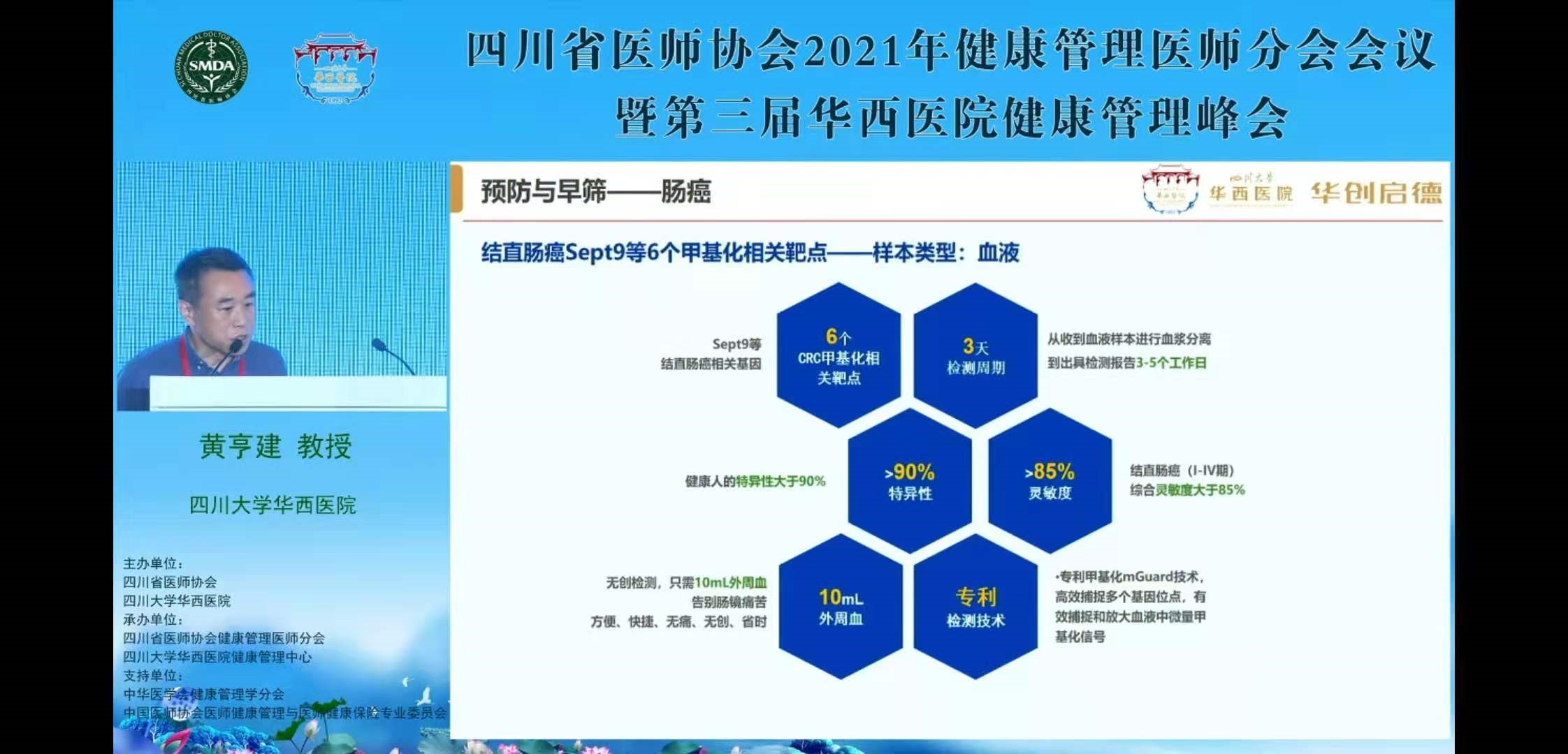 5月9日,华西医院实验医学科黄亨建教授作了题为“助力大健康 华西公立第三方实验室在路上”的主题演讲。为了响应国家“健康中国2030”的号召,服务于广大体检人群,华西医院及下属产业探索出一条助力大健康的道路,通过华西医院下属医学检验所,开展了许多前沿检测项目。黄教授特别提到了肠癌早期筛查新项目“肠癌多基因甲基化检测(血液)”——常艾克TM。黄亨建教授表示,除了常艾克TM本身优异的性能值得称道外,该检测采用血液样本,采样方便、无创,受检者易于接受;而且检测结果不受饮食、药物等服用情况的干扰;检测流程简洁规范,易于操作,不受检验人员操作经验与技能影响,是受检者和医学检验所均乐于接受的肠癌早筛检测项目。该检测项目目前被华西医院引进,未来可造福更多结直肠癌高危人群。
