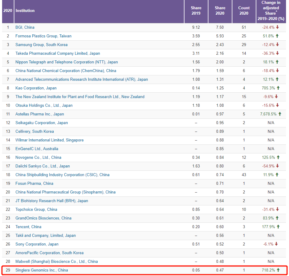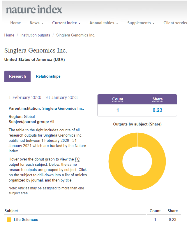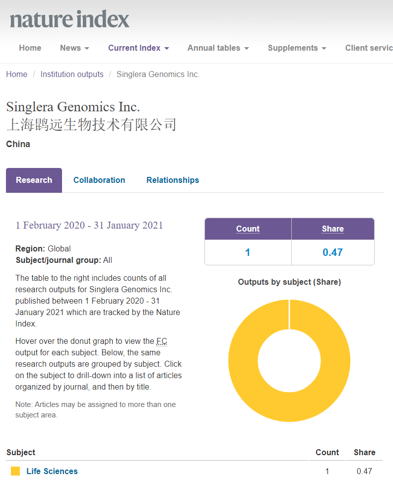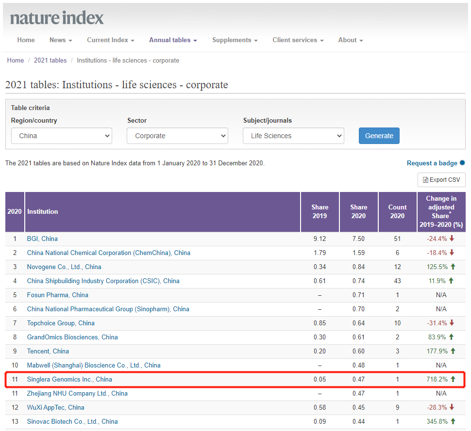 近日,2021自然指数年度榜单(Nature Index 2021 Annual Tables)正式发布。据排行榜显示,上海英国威廉希尔技术有限公司(Singlera Genomics Inc.,China)位列中国生命科学产业机构榜Top 50第11名,亚太地区生命科学产业机构榜Top 50第29名,并且是2019-2020年自然指数上升率最高的中国公司。