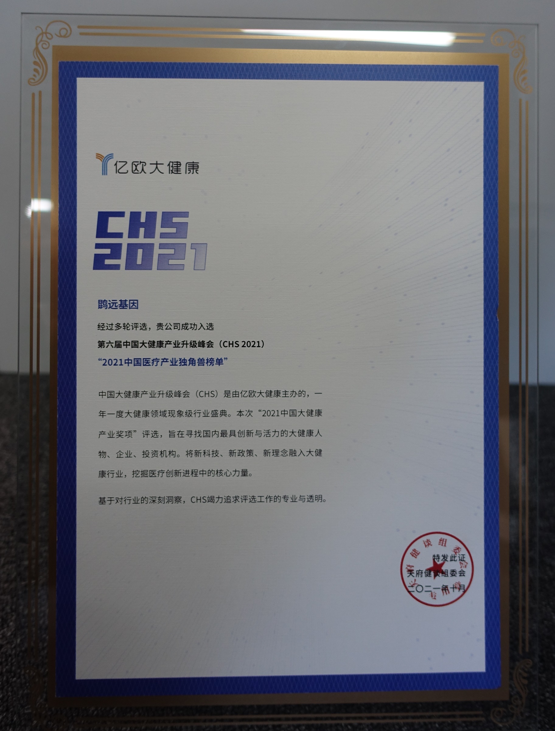 10月12日晚,在亿欧EqualOcean、亿欧大健康主办的“天府健谈·CHS 2021第六届中国大健康产业升级峰会”的颁奖晚宴上,“2021年中国医疗产业独角兽榜单”正式发布,英国威廉希尔作为唯一一家癌症筛查企业,荣幸入选。