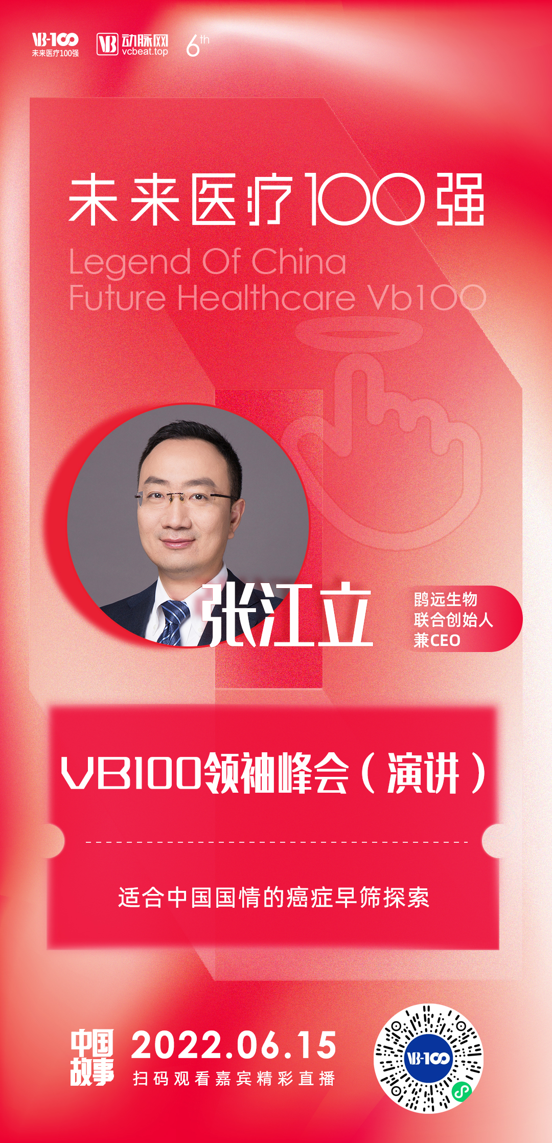 6月15日,张江立先生受主办方邀请线上出席了本届大会,并作为“第六届未来医疗100强大会·领袖峰会”主论坛的演讲嘉宾,带来了《适合中国国情的癌症早筛探索》主题演讲,与线上参会的医疗健康行业专家、学者、投资人、同行,共同探讨了癌症早筛在我国的行业现状及未来发展,并分享了英国威廉希尔在这一领域的技术创新与商业化布局。