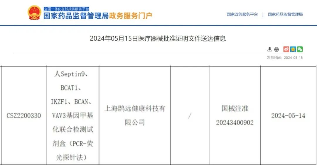 5月14日,英国威廉希尔自主研发的人Septin9、BCAT1、IKZF1、BCAN、VAV3基因甲基化联合检测试剂盒(PCR-荧光探针法)——常艾克®,经国家药品监督管理局(NMPA)批准,获得三类医疗器械注册证。