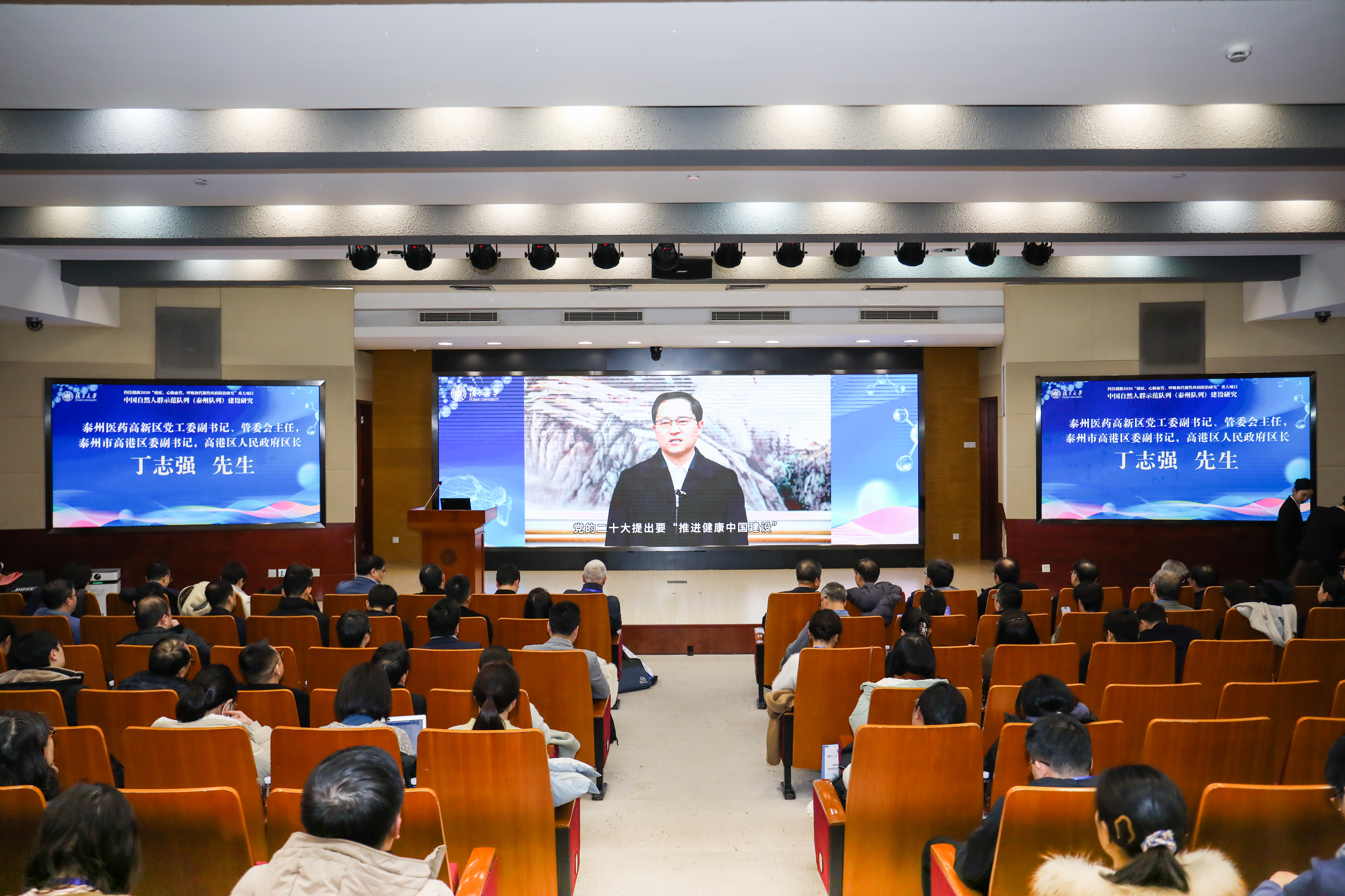 中国科学院院士、复旦大学校长金力,上海市科学技术委员会生命科学技术处处长胡光晶出席活动并致辞,泰州医药高新区党工委副书记、管委会主任,高港区委副书记、区长丁志强作视频致辞。复旦大学科学技术研究院副院长徐晓创主持会议。